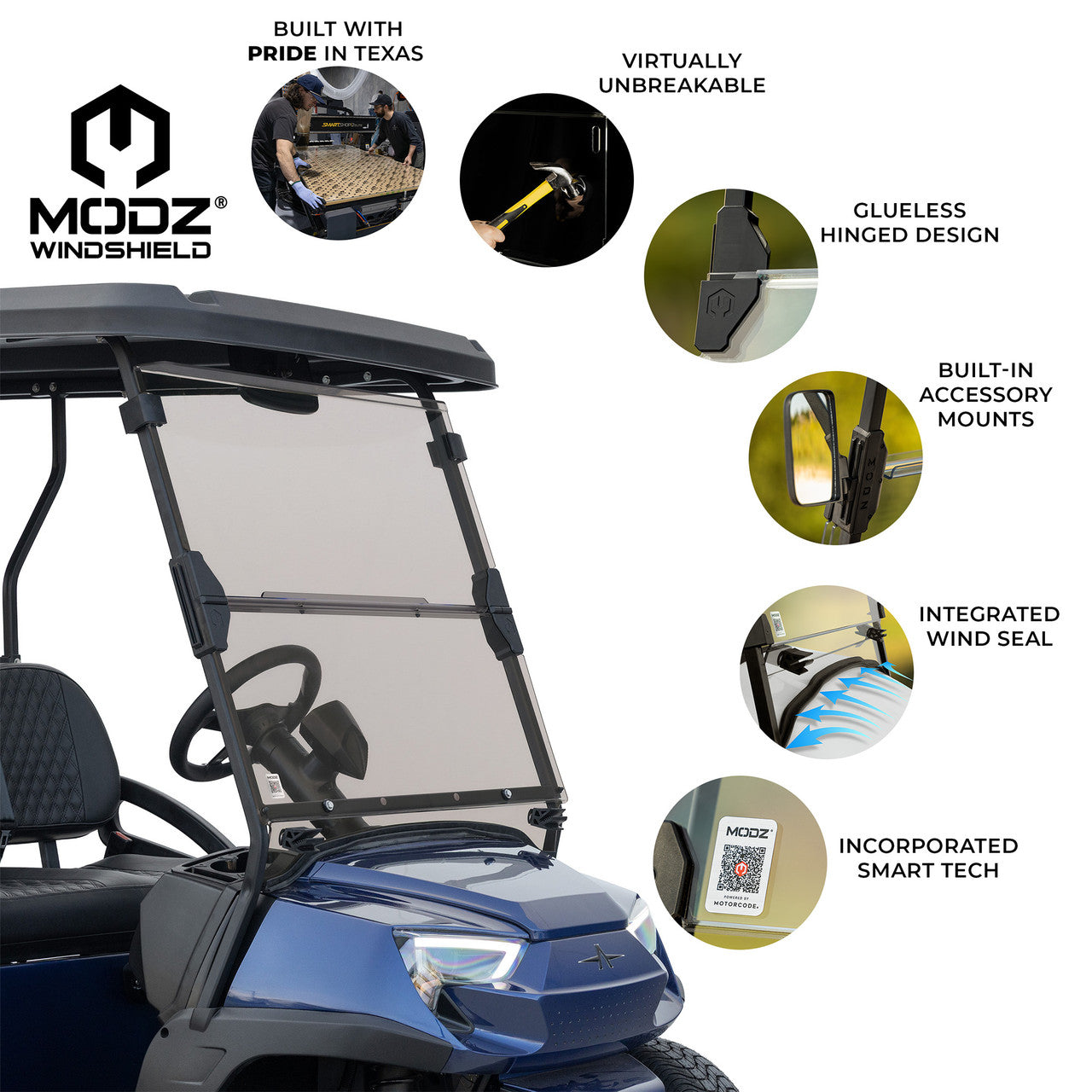 The MODZ Windshield is more than just protection—it’s a performance upgrade that combines strength, innovation, and convenience to elevate your golf cart experience.